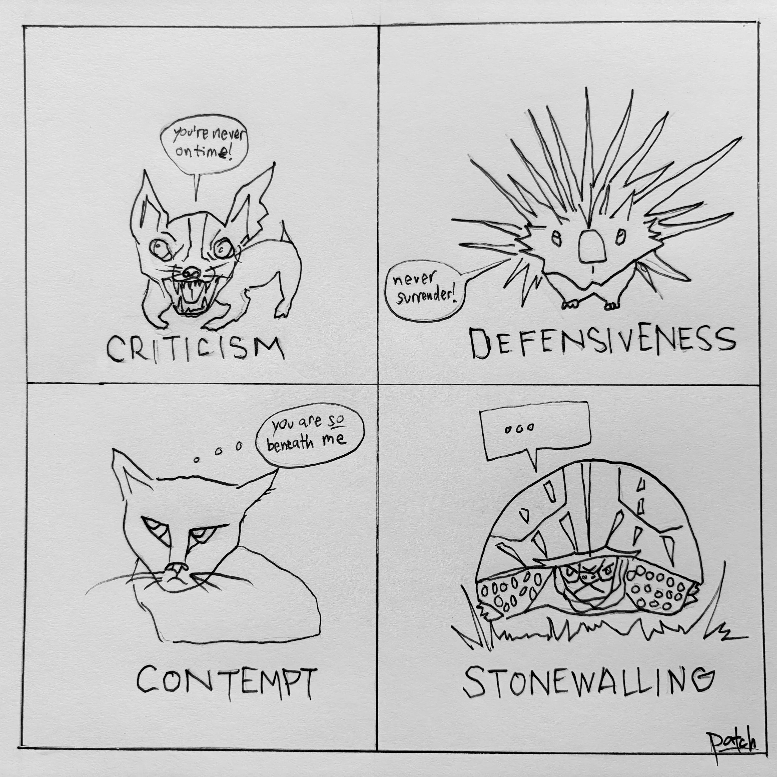 Stonewalling: typically a response to contempt, we turn to a stone and go silent, shut down, completely tune out and withdraw