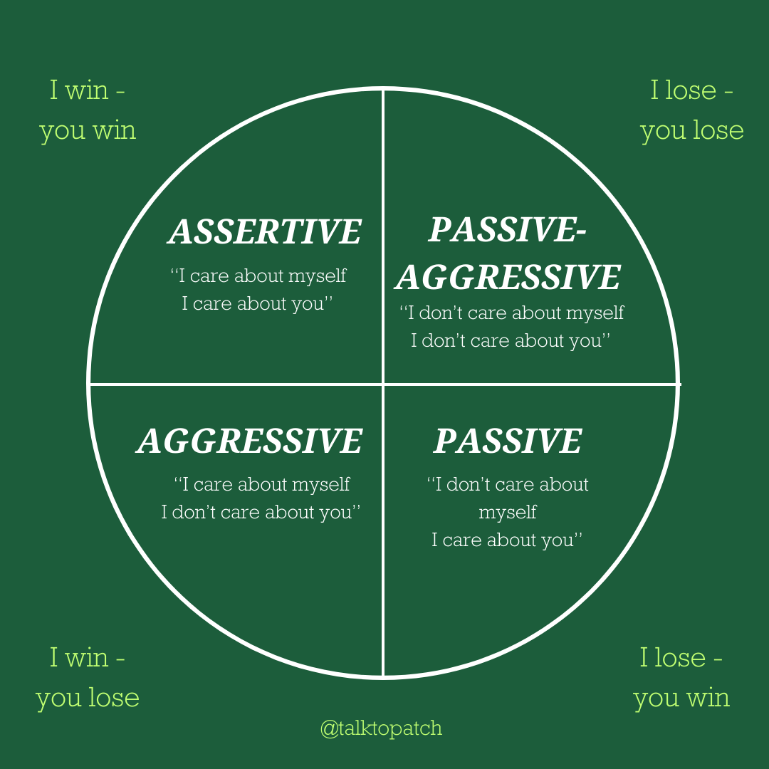 Emphasizes the importance of both people’s needs. Person stands up for their own needs/wants/feelings, yet listens to others’. Confident and respectful. “Firm”.